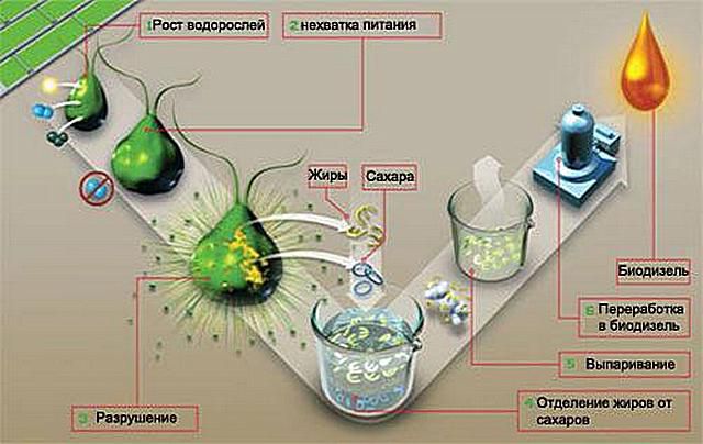 Когато се създадат определени условия за растежа и живота на водораслите в изкуствени резервоари (биореактори), те активно натрупват растителни мазнини и захари, които след това по време на преработката се превръщат в първоначален продукт за получаване на горими въглеводороди. Като цяло само самото оборудване е с висока цена, а водораслите се нуждаят само от вода, слънчева светлина и въглероден диоксид за активен растеж.