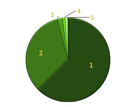 Ето как изглежда диаграмата за разпределение на газа на сместа: 1 - съдържание на метан около 63-65%; 2 - съдържанието на въглероден диоксид е около 30-33%; 3 - съдържанието на сероводород е около 2%; 4 - съдържанието на амоняк е около 1%; 5 - съдържание на водород около 1%