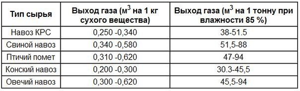 Таблица, показваща ефективността на определен вид биологични отпадъци по отношение на обема на произведения газ. Както се вижда от таблицата, най-ефективен е свинският тор, който може да произведе най-голямо количество биогориво.