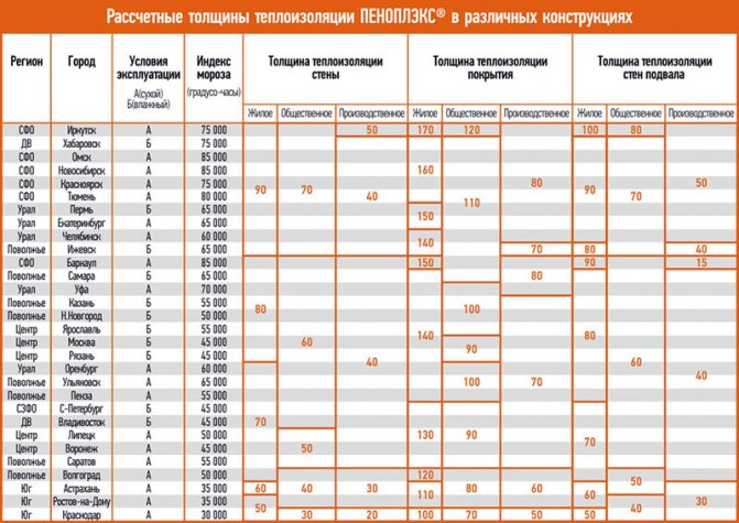 При изчисляване на необходимия слой Penoplex основният показател е необходимото термично съпротивление на конструкцията. Данните за тази характеристика на стени, подове, подове са обобщени в таблици SNiP за различните региони на експлоатация. Например в региона на Москва стандартите SNiP препоръчват този параметър за капитални стени 3 единици, за подове 3,9 единици.