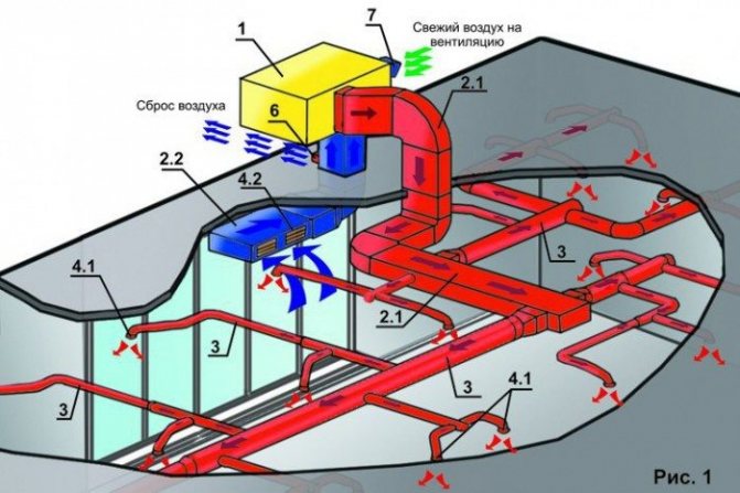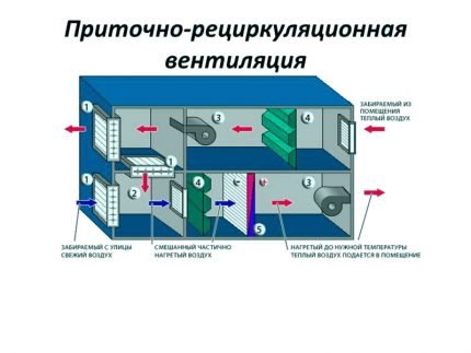 В системите за подаване и рециркулация част от въздуха се взима от улицата, а другата част се взима от стаята. И двете части се смесват и след нагряване до необходимата температура се доставят в помещението.