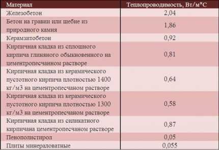 При определяне на k трябва да се използва информация от таблици или по-добре - информация от технически паспорт, тъй като съставът на материалите от различни производители може да се различава, следователно има различни характеристики.