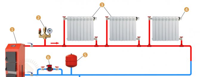 Еднотръбна отоплителна система с принудителна циркулация: 1 - отоплителен котел; 2 - група за сигурност; 3 - отоплителни радиатори; 4 - кран на Маевски; 5 - разширителен резервоар; 6 - циркулационна помпа; 7 - изтичане