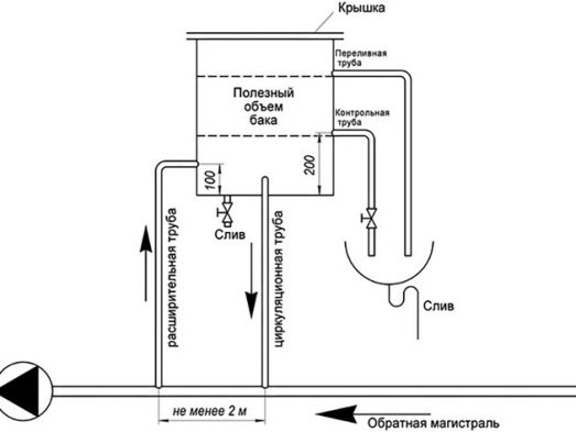 Всеки домашен майстор с умения за заваряване знае как да заварява кутия. След това тръбите се нарязват в отворения разширителен резервоар и се затварят херметически. Капакът е разхлабен, така че въздухът може свободно да преминава вътре. Когато всичко е готово, остава само да се проверят заваръчните шевове за пропускливост и да се монтира контейнерът на място, както е показано на диаграмата: