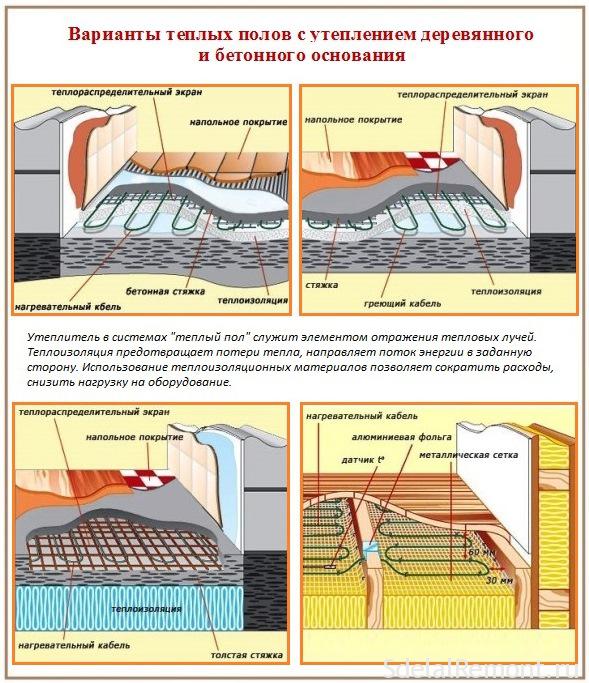 Има специални подложки от пяна, на повърхността на които има неравности. Те са подредени на редове на равни интервали, като решетъчни клетки. Такива постелки просто се полагат на пода, върху тях се извършва окабеляване и всичко това се излива с разтвор. Лесно, бързо и качествено. Нови технологии обаче.