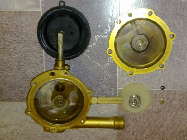 Водният регулатор е метален възел с празна кухина, разделена на две части с диафрагма.- Първото отделение е необходимо за пълнене с вода. След отваряне на крана за подаване на топла вода, течността попада в свързаната част на регулатора. Налягането се натрупва вътре в сглобката, която огъва уплътнението.