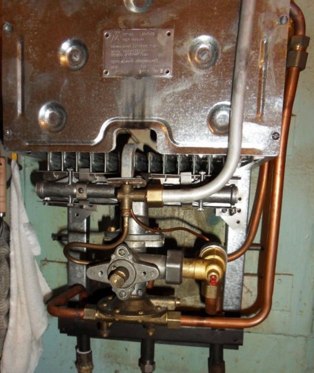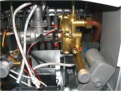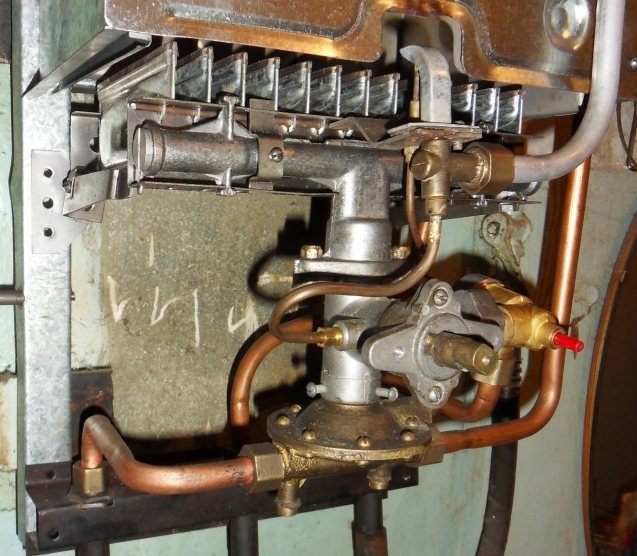 Пред вас ще се отвори воден възел. В по-ранните модели той е разположен отделно, вертикално. Отгоре е монтиран газов блок, вляво е организирано водоснабдяване, вдясно е топлообменник.