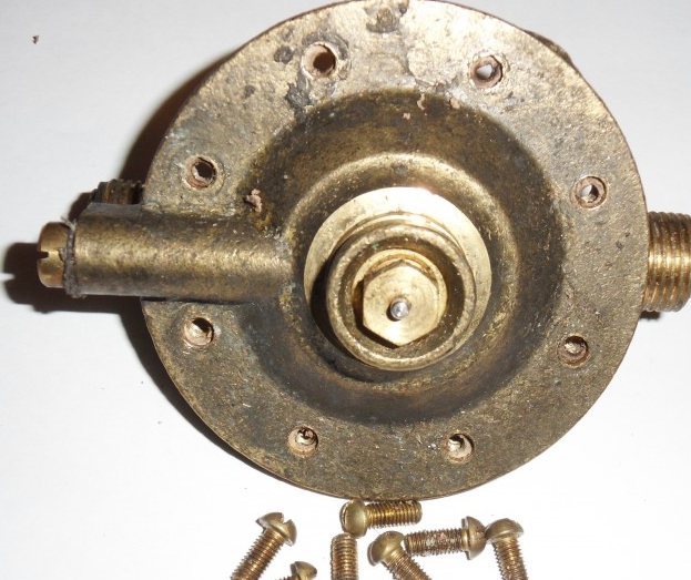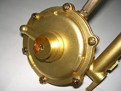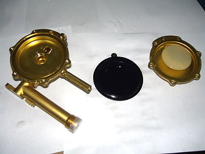 2. Третата снимка показва как са закрепени един към друг: с помощта на два винта, просто изстисквайки този „цилиндър за грес“ на водния агрегат от краищата. Помислете за водната част. Снимка 4. Тук, където е смазката, виждате ли дупка в края на цилиндъра? Именно от тази дупка излиза стеблото, което отваря достъп на газ до колоната. Именно тя (стъблото) избутва нашата мембрана при отваряне на крана.