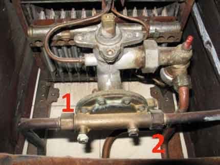 Две позиции за демонтиране: 1 - гайка на тръбата на входа на устройството за контрол на налягането; 2 - гайка на тръбата на изходящия разклонител. Трябва да се използват и дренажни тапи.