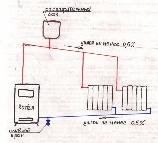 - В най-ниската точка на системата (обикновено близо до котела), трябва да инсталирате кран с кран - през него водата ще се излива в системата.