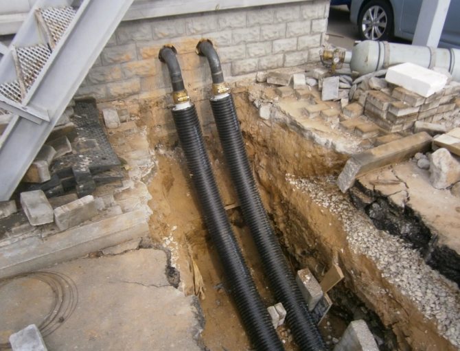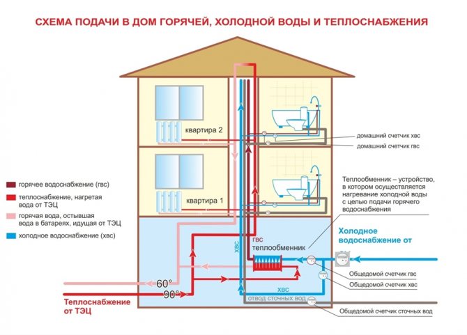 Системата за захранване с топла вода е свързана директно към отоплителната точка на сградата. Снимката по-долу показва как се случва това. Един клон е вграден от захранващия тръбопровод,