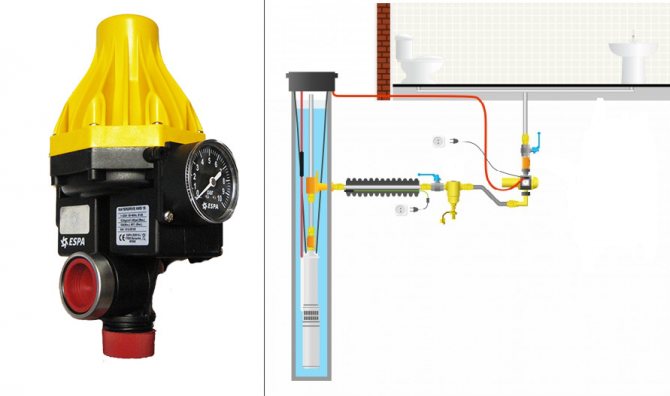 За да намалите разходите за комплект съоръжения под налягане, можете да използвате схема на свързване на помпата за сондаж само с превключвател за налягане без блок за управление. Устройството изключва помпата, когато налягането достигне максималното си, и го стартира, когато индикаторите намалят до минимум.