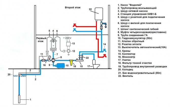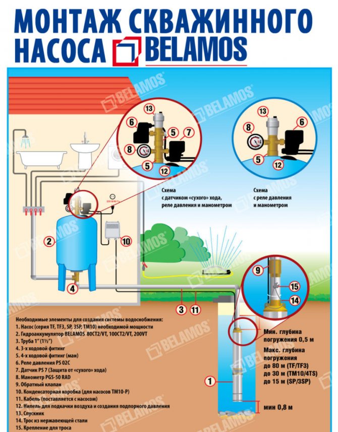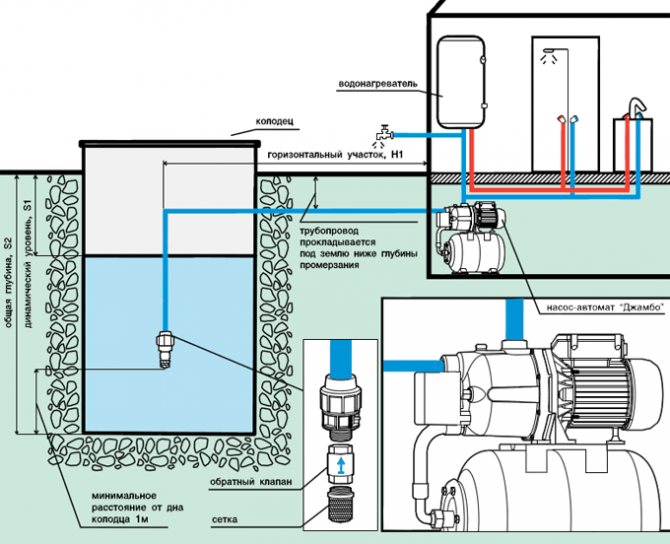 Инструкцията показва, че повърхностните помпи могат да бъдат инсталирани в кладенец, ако дълбочината му е до 20 метра. В този случай водата идва директно от кладенеца до точките за разбор. Схемата за свързване на повърхностна помпа към кладенец включва следното оборудване: