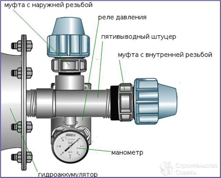 В процеса на свързване хидравличният резервоар се обвива с фум лента. След това се завинтва американският адаптер. Месинговият адаптер е снабден с превключвател за налягане и манометър. За производството на специален лакът се използват пластмасова тръба и фитинг. За свързване на маркуча се използва съединител тип цангол.