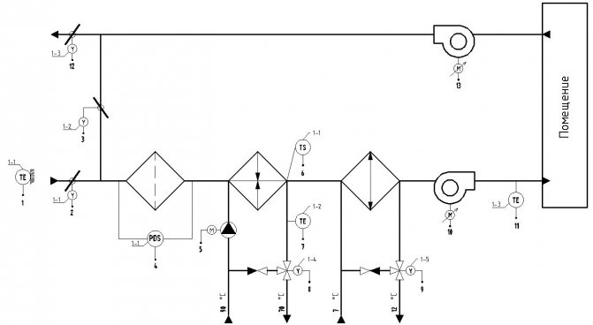 Основната схема за изпълнение на захранваща и изпускателна вентилация с рециркулация на въздуха