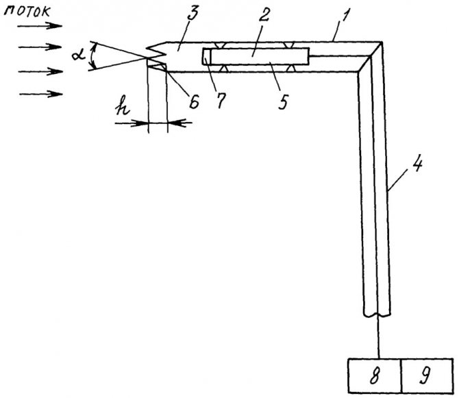Диаграма на приемника за общо налягане: 1 - приемна тръба, 2 - преобразувател на налягане, 3 - спирачна камера, 4 - държач, 5 - пръстеновиден канал, 6 - преден ръб, 7 - входна решетка, 8 - нормализатор, 9 - записващ изходен сигнал , α - ъгъл при върховете, h - дълбочина на долините