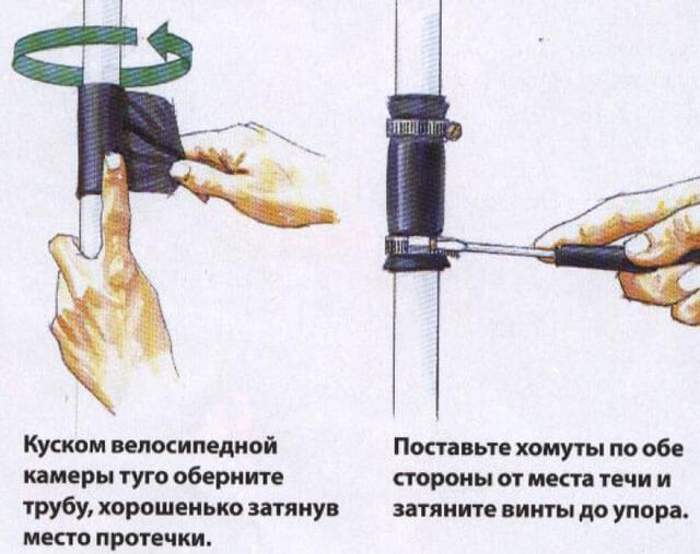| Гумени подложки | Лента от каучук с дължина, по-голяма от диаметъра на тръбата с 50 mm и по-малка от обиколката на скобата с около 100 mm, се увива около тръбата на мястото на повредата. Превръзката е здраво закрепена със скоба. | Универсален метод, който е подходящ за отстраняване на течове от различен тип по тръбопроводи за различни цели. Ако дупката е малка, дори не е нужно да прекъсвате подаването на вода. |