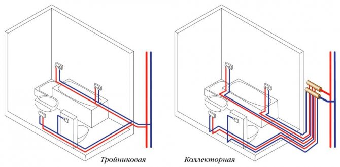 - Тройник (сериен) окабеляване включва свързването на всички устройства (отопление или водопровод) към общо захранване или бутилиране с помощта на тройни връзки;