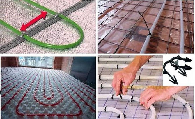 Това са основните начини за фиксиране на тръбата за подово отопление. Най-икономичният - до мрежата с връзки. Връзките могат да бъдат заменени с тел, но това ще бъде по-евтино само ако имате свободен проводник.