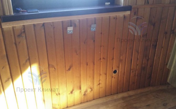 Външното тяло на термопомпата е разположено зад въздухопрозрачните жалузи. Той е достатъчно голям и прилича на индустриален климатик. През зимата тялото на помпата замръзва и е покрито с плътна снежна обвивка. Това е процес, предвиден в неговата работа - според вътрешните си алгоритми оборудването редовно отива на размразяване и напълно се размразява. След това всичко се повтаря.
