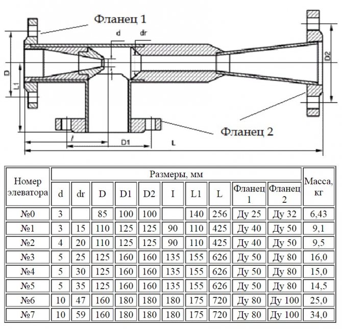 За да изберете асансьорната единица на отоплителната система според размера на дюзата, трябва да го изчислите, като използвате формулата: