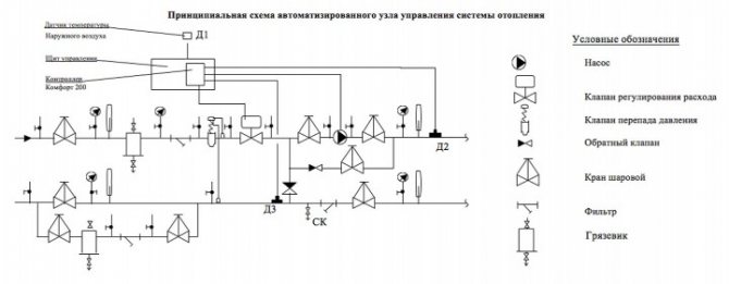 - изпълнение и контрол на поддържането на зададения температурен график на подаващите и връщащите тръбопроводи... Това позволява на системата да бъде защитена от хипотермия и прегряване,