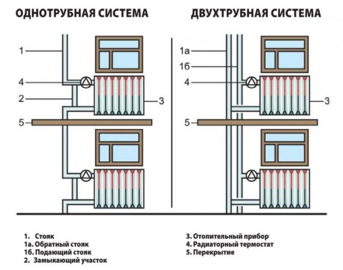 В големите сгради най-често окабеляването към апартамента се извършва с помощта на двутръбна система, а окабеляването през пода се извършва с еднотръбна система: