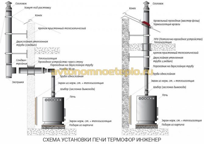 Отоплителното оборудване на твърдо гориво принадлежи към класа печки с висока температура на димните газове. По време на горенето, вътре в горивната камера, интензивността на нагряване достига 450-550 ° C. Въпреки че поради използването на газообразуване димът се охлажда значително на изхода, температурата все още остава достатъчна, за да доведе до изгаряне и деформация на конвенционален стоманен комин.