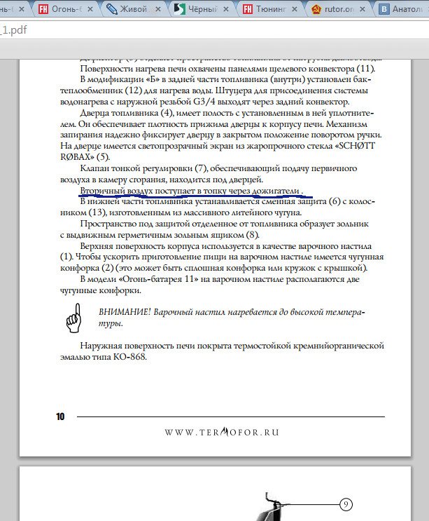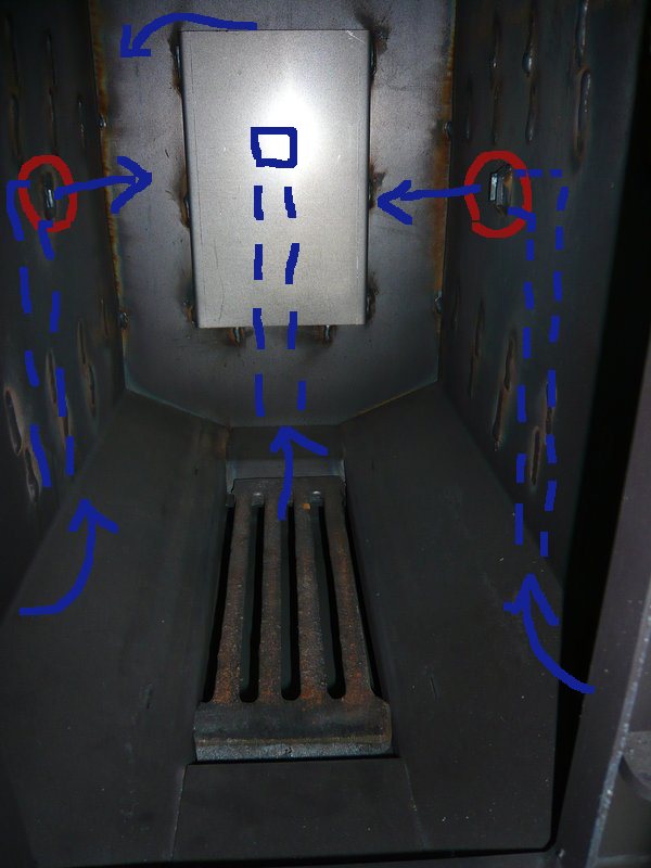 1) Трябва да има дюзи (канали за доизгаряне на газове вътре в пещта), които ви позволяват да получите режим на тлеене на дървесина, със затворен приток на кислород от други части на пещта (пепелник, амортисьори на точковото подаване на въздух)