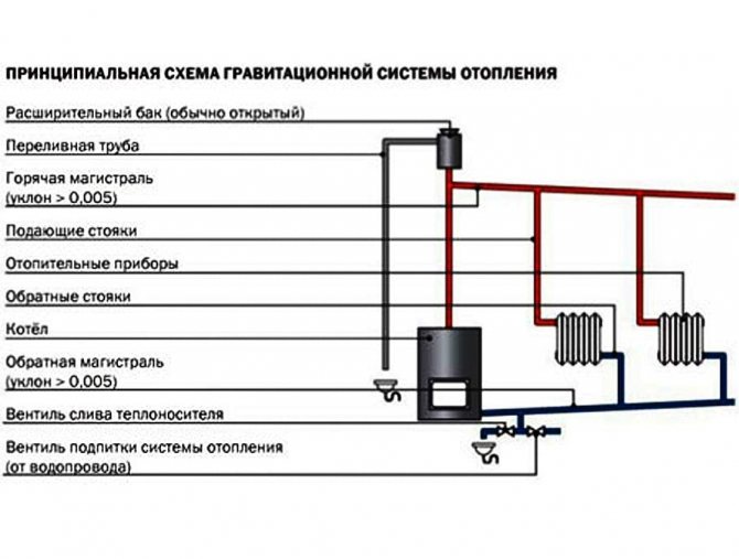 Гравитационното отопление е относително просто, но е необходимо стриктно да се спазват необходимите наклони в посока на движение на охлаждащата течност