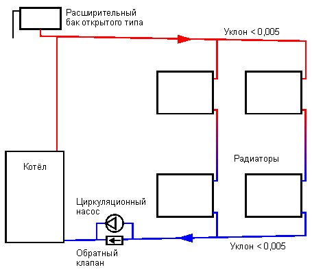 Пример за циркулационно отопление, наклоните на тръбите всъщност нямат значение