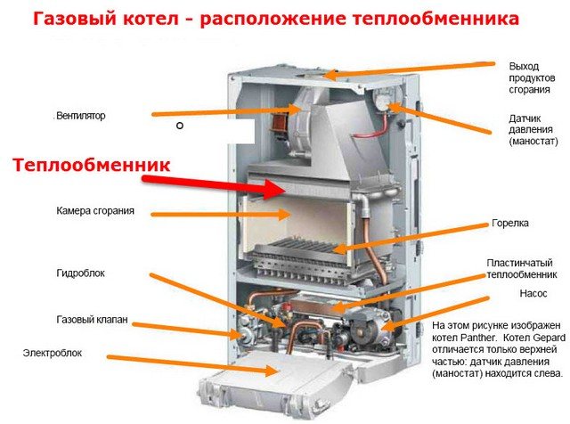 В началото не забравяйте, че топлообменникът е основният елемент, като такъв, в устройството на газов котел. Чрез топлообменника топлинната енергия от горивния газ се прехвърля към топлоносителя (първичен топлообменник), а през топлообменника от горещия топлоносител към студения (вторичен топлообменник). Струва си да се отбележи, че и двата топлообменника много често се заменят със смесен топлообменник, който е по-известен като битермален топлообменник. На първата снимка разглеждаме местоположението на топлообменника в газов котел със затворена горивна камера.
