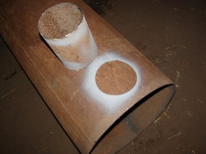 - С помощта на мелница изрежете с мелница отвор за комина в голямата тръба. Оптималното разстояние е 100 мм отгоре.