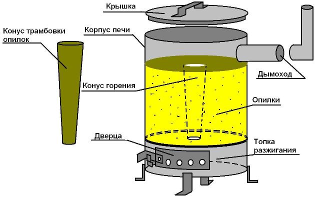 Това означава, че за да могат дървените стърготини да горят дълго време и равномерно да отделят топлина, те трябва да бъдат добре натъпкани. Въз основа на този принцип ще изградим пещ или котел върху дървени стърготини.