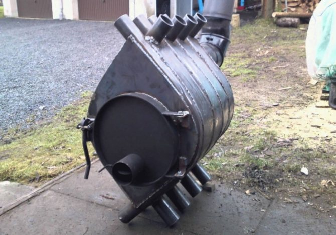 В корпуса на печката е направена врата, а отгоре е направен отвор за медна тръба.