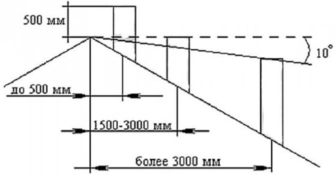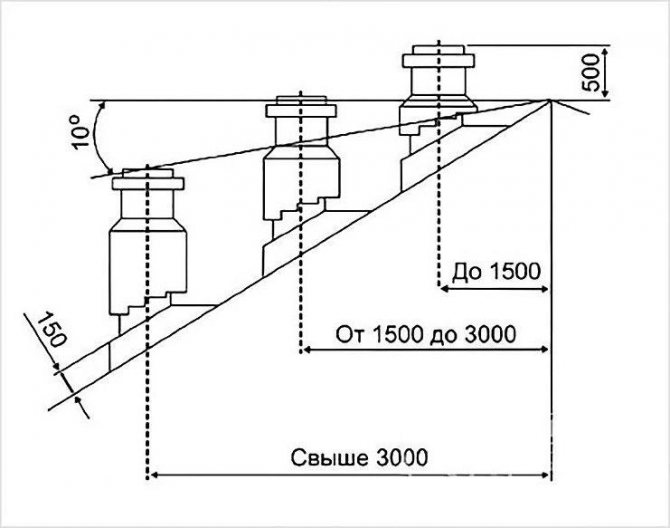 - Коминът е разположен от билото на покрива на разстояние до 1500 милиметра, което означава, че изходът на тръбата трябва да бъде разположен на височина 50 сантиметра над горната част на билото;