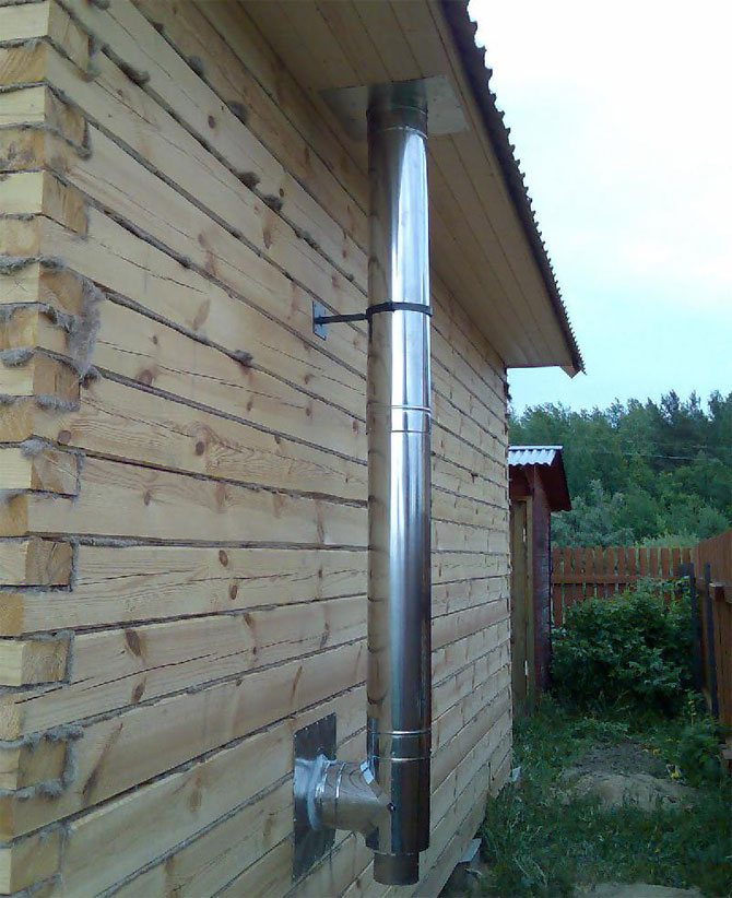 - в стената на нивото на изхода от печката. Най-безопасният начин за стрелба, тъй като целият комин е отвън. Но той има редица недостатъци, основният от които е бързото охлаждане на тръбата.В тази връзка студеният въздух черпи топлина от печката и впоследствие от стаята. Тоест, след като печката е изгоряла, е необходимо да изключите комина, така че стаята да не може да се охлажда през него.