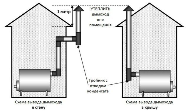 Вторият вариант за изхода на тръбата е през стената, а не през покрива. В този случай краят на комина трябва да бъде разположен точно под върха на билото на покрива.
