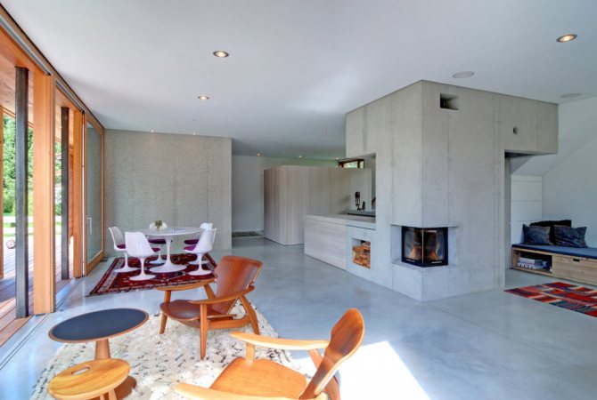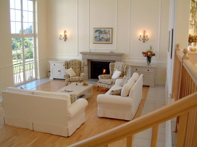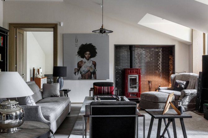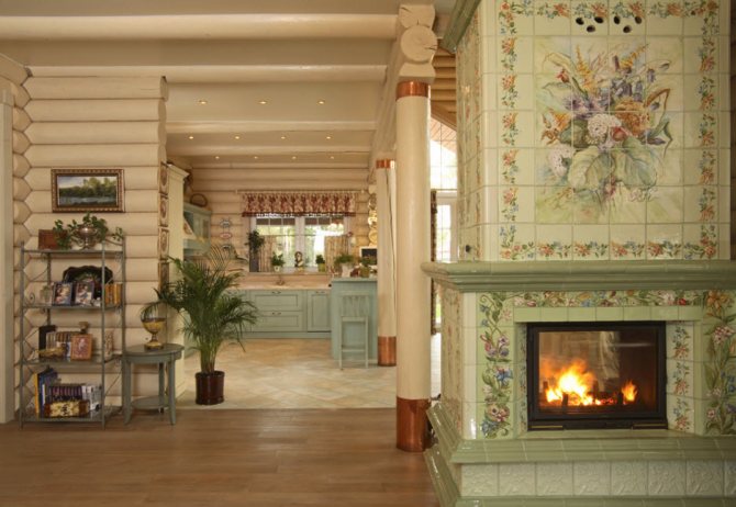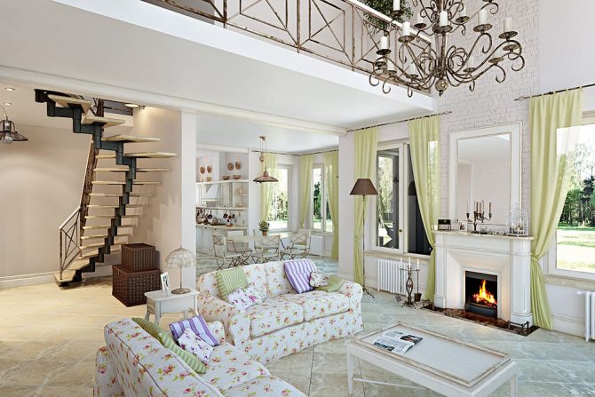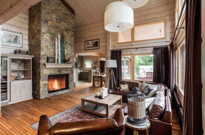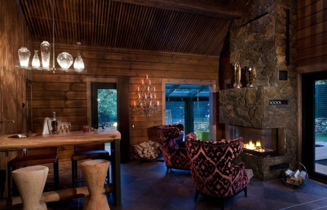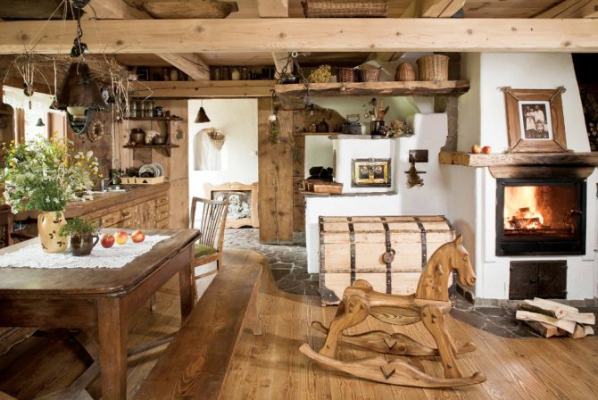 Интериорът близо до огъня се променя в правилната посока. Столовете стават все по-масивни, получават груба тапицерия. Тук често се поставят плетени мебели и люлеещи се столове от ратан с пухкаво одеяло. Според същите канони дизайнерите украсяват съседни стилове. Под живия пламък "Chalet" и "Provence" стават много по-удобни.