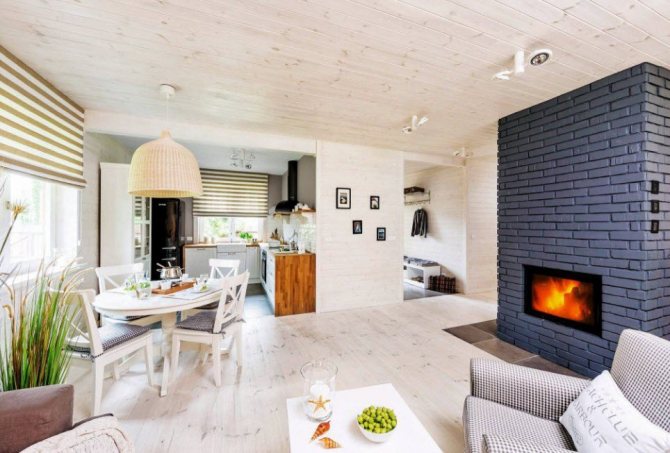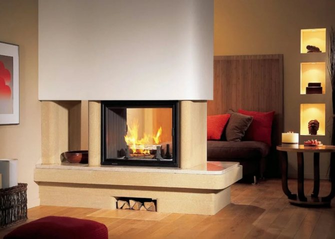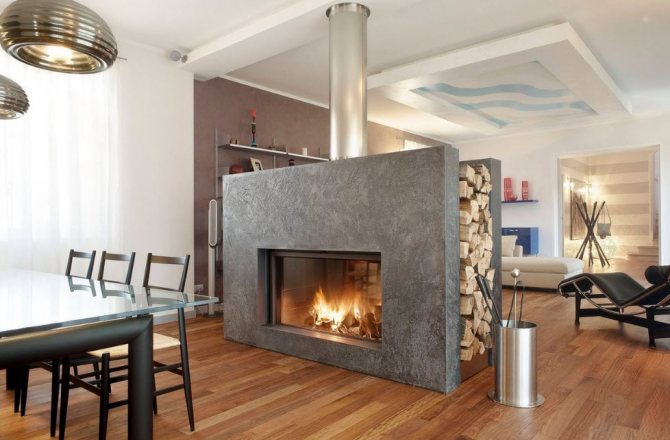 Друга възможност за огнището на стената е да го разположите перпендикулярно на стената. По този начин е лесно да се зонира пространството на кухнята - хола. Това нестандартно решение значително разнообразява интериора. Важно е само да запомните, че вратите на огнището не могат да се отварят от двете страни. В този случай всички продукти от горенето няма да влязат в комина, а ще се разпространят в цялата къща. Вратите в крайното устройство могат да бъдат направени от топлоустойчиво стъкло - в този случай можете да се възхищавате на пламъците от двете страни.