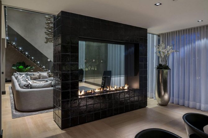 - hi-tech - при производството на камини в този стил се използват съвременни материали - стомана, огнеупорна пластмаса, хром, стъкло и керамика. Класически пример за високотехнологична камина е металната камина, изработена от полирана (най-често) или текстурирана стомана, която се допълва от вложки от хромирани части. Металните високотехнологични камини могат да бъдат правоъгълни, удължени или кръгли, докато дизайнът на прозрачната врата е стилизиран като плазмен екран - голям екран, често удължен хоризонтално, така че зрелищната игра на пламъци се вижда ясно.За да се увеличи и подобри видимостта, се монтират врати с U-образна секция или с формата на буквата L, в резултат на това само задната стена на камината остава непрозрачна. Високотехнологичните интериори обаче често използват „проходни“ камини с успоредни прозрачни стени, които могат да бъдат монтирани в гранична стена.