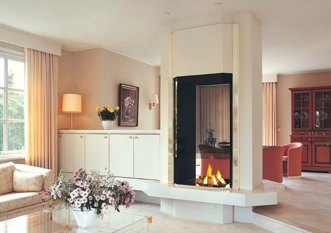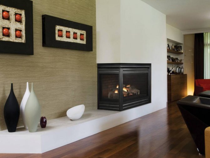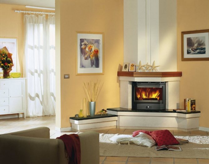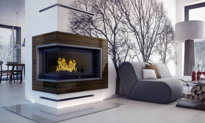 Ъгловите камини спестяват значително място. Те се вписват удобно във всяка стая, заемайки малко място. Външните ъглови печки са подходящи за просторни стаи, коридори или големи зали.В този случай камината има две врати и езиците на пламъка могат да се наблюдават от всяко място.