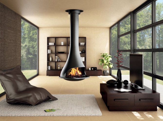 В стая с островна камина ще трябва да ограничите количеството мебели, в противен случай ще се създаде впечатлението за тесни и натрупани. Цялото внимание е насочено към огнището. Качулката за него е направена под формата на правилна капачка. Не забравяйте, че конструкцията трябва да има сигурно фиксиран комин.
