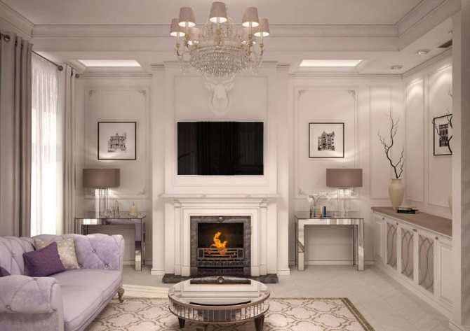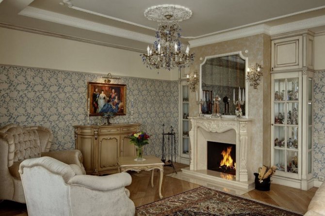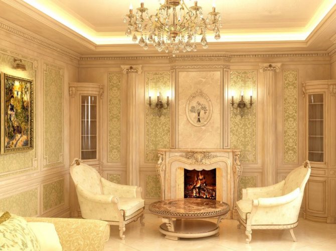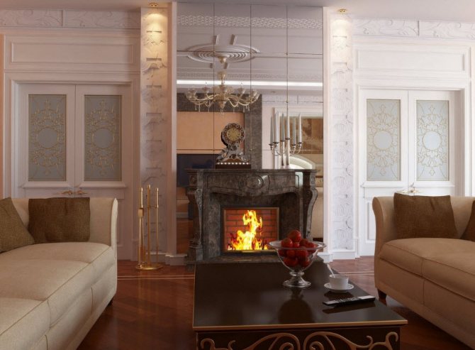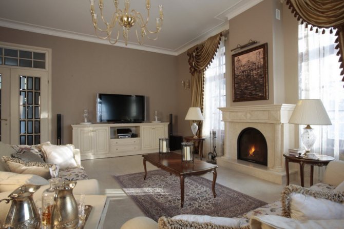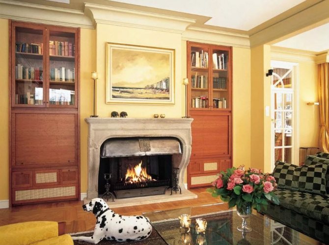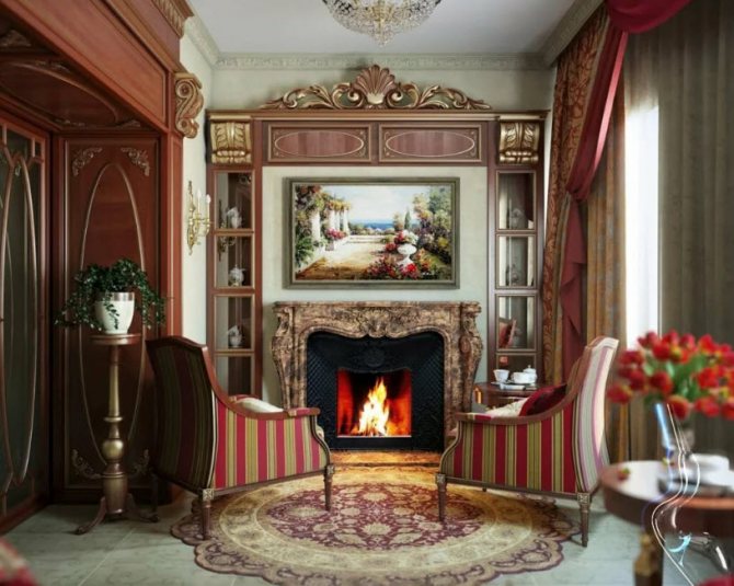 Пожар в "класически стил" За класика Пожарна - основата на целия състав. Когато декорират пространството, декораторите използват само опция за ъгъл или стена. Тук не е приемливо „островно“ огнище и видът на камината се диктува от категорията на къщата. Ключът към стила е портал за камина... Мраморни шарки, дърворезби, тухлена зидария - това са най-успешните декоративни елементи за класиката. А камината ще бъде украсена с бронзови свещници и луксозен порцелан.