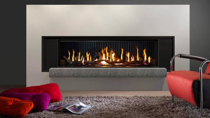 Друг сорт е газова камина... Несъмнените предимства на използването му включват възможността да го инсталирате във всяка стая, било то частна къща или апартамент. Камината е украсена с изкуствени дърва за огрев; тя ще работи от природен газ. Такава камина ще ви позволи да отоплявате голяма жилищна площ за минимален период от време и с най-ниски разходи. Освен това несъмнен плюс е липсата на сажди и сажди, които периодично ще трябва да се почистват. Недостатъкът на газовата камина е наличието на специално разрешение за нейното инсталиране и експлоатация от газовата служба.