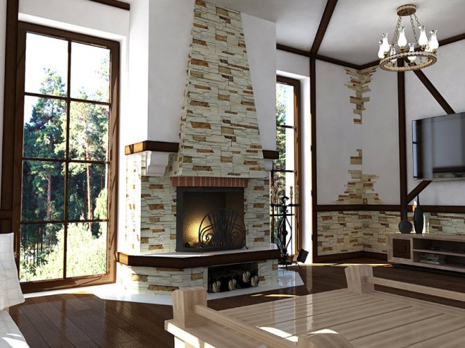 - полуотворени - най-често това са прикрепени камини, в които коминът (канал за изпускане на дим) е прикрепен към стената, което ви позволява да експериментирате с техния дизайн. За разлика от затворената, в полузатворена камина една (или две) странични стени на камината отсъстват частично или напълно, в резултат на това огънят в огнището визуално е по-отворен. Ако сравним топлотехническите характеристики на затворените и полузатворените камини, тогава последните губят, тъй като повече въздух отива в комина от отопляемото помещение, но в същото време те имат по-голям радиус, по който се появява топлинното излъчване. Ъгловите камини за дома (дърва или друго твърдо гориво) са един от видовете полуотворени камини, които не само ви позволяват да използвате малко използвано ъглово пространство, но и осигуряват отопление на съседни стаи