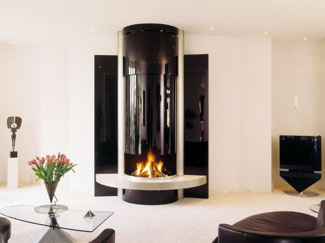 - Модерен дизайн (хай-тек, минимализъм). В този случай трябва да инсталирате камина с необичайна форма, изработена от стъкло и метал.