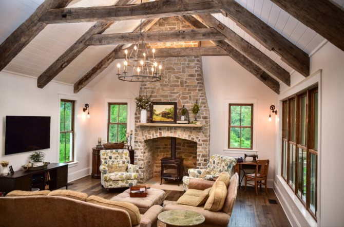 - селски стил е тухлена камина с необичайна портална форма, която е сходна по контур с буквата "D". Камината в камината "рустик" е разположена в центъра, долната част, с вдлъбнатина, се отвежда за дърва за огрев, страничните части са направени под формата на банкети. Задължителен елемент е дървена греда, която се полага отгоре, над камината. Той служи като вид стойка за многобройни аксесоари и декоративни орнаменти: свещници, рамкирани снимки, часовници, фигурки и др. Камината в селски (селски) стил е увенчана с кожух или капачка, като в повечето случаи изпълнява само декоративна роля. За облицовка на камината се използват черупки, пясъчник или, много по-рядко, мрамор. Първите два камъка са доста евтини и лесни за обработка, но имат един съществен недостатък - неудобство при поддръжката, тъй като прахът може да се натрупва в камъка поради високата порьозност