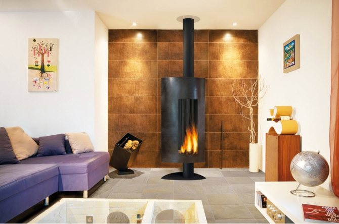 Островна камина стои в средата на стаята, без да се опира на никоя от стените. Ясно е, че стаята трябва да е много голяма, конструкцията заема много място. Дизайнерите дори са измислили висящи огнища - те са прикрепени към тавана във висока зала.