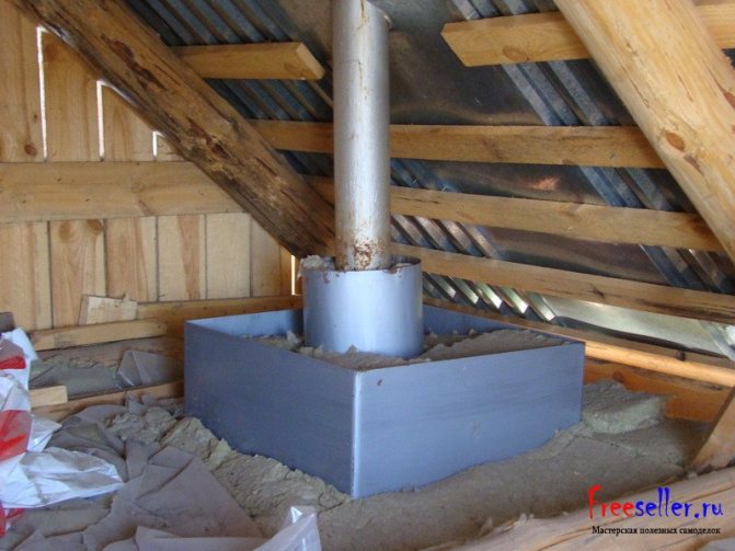 Горната част на комина е обвита с някой от тези материали: започвайки от фугата отдолу до изхода от отвора на покрива. За закрепване на изолацията се използват метални скоби.
